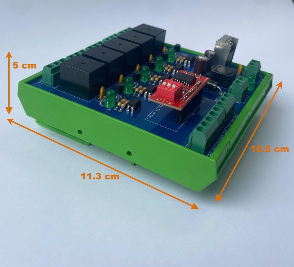 Besleme voltajı 12 volt DC, üzerindeki soğutmalı LM2576T-5 modülü ile harici 5volt çıkışı mevcuttur. 5adet NC NO çıkışlı Röleler mevcuttur.