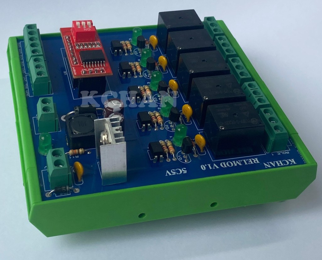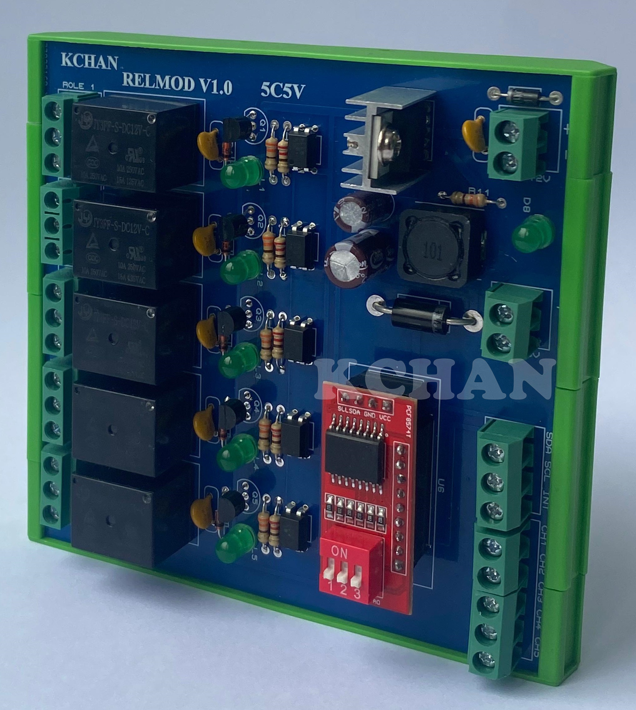 RELMOD 5C5V v1.0 (RELAY MODULE 5 channel 5Volt) KCHAN tarafından tasarlanmıştır. Arduino veya diğer başka mikrodenetleyeciler ile kullanılabilen bir röle kartıdır. Her bir röle için Röle durumunu gösteren yeşil ledler bulunmaktadır